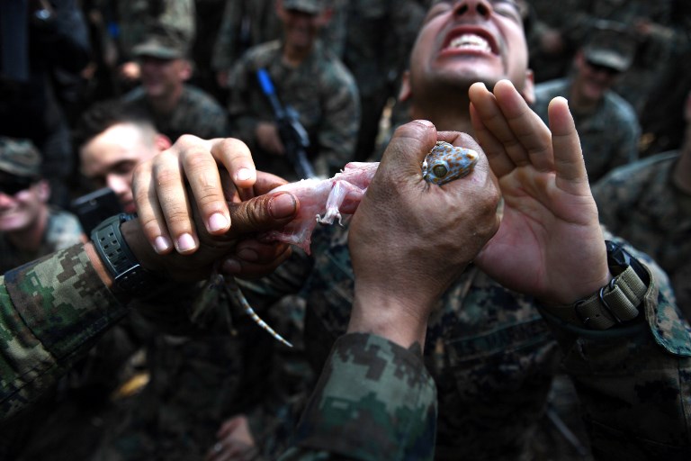 A US Marine eats a gecko during a jungle survival training with Thai soldiers in the joint 'Cobra Gold' military exercise in Chantaburi province Lillian SUWANRUMPHA / AFP