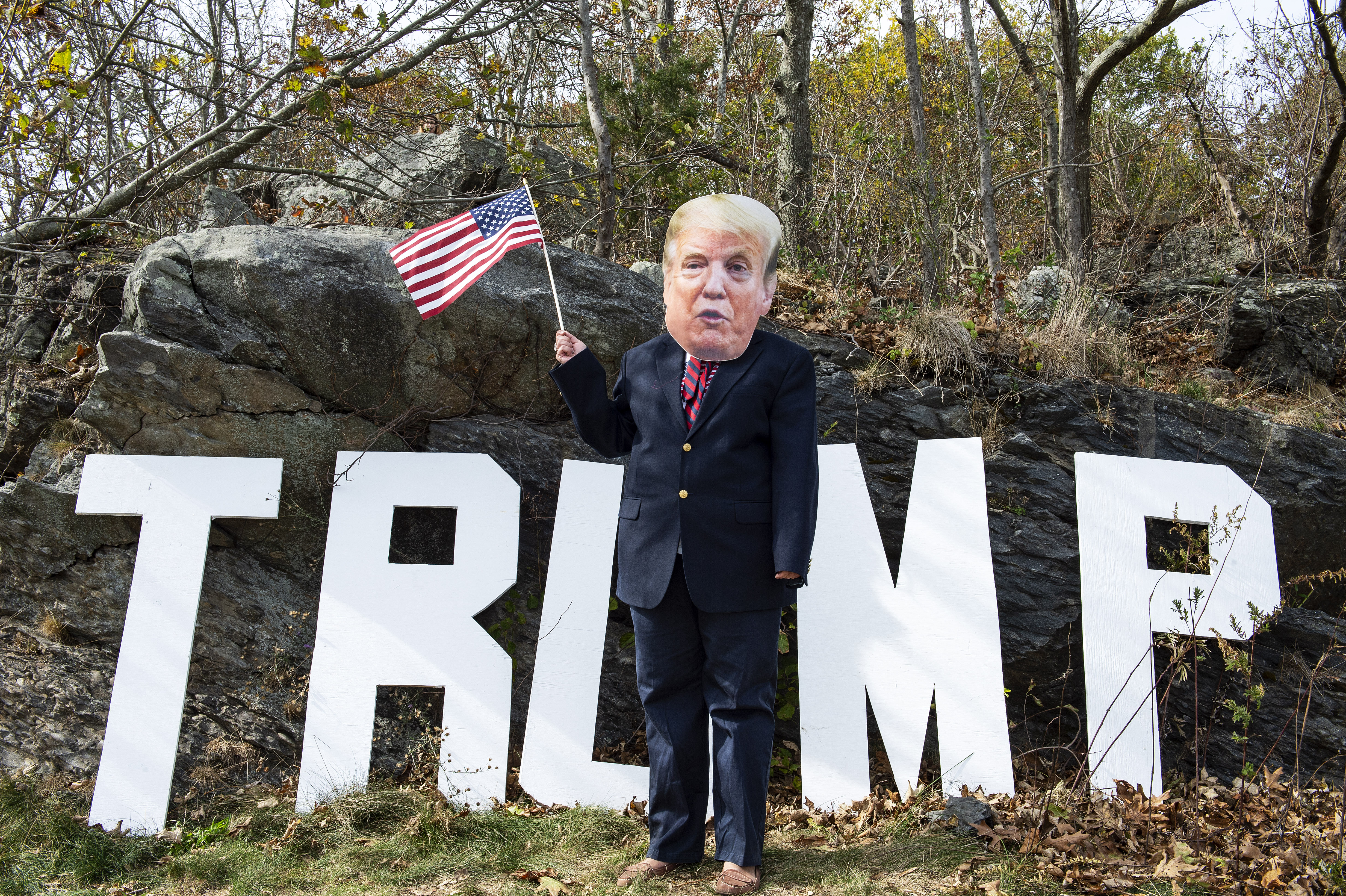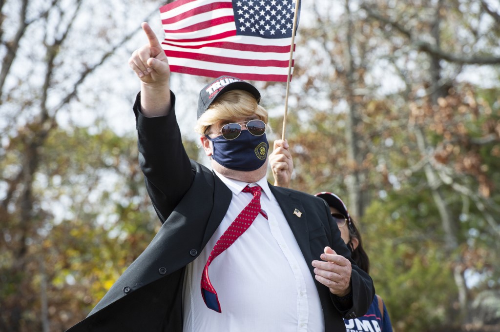A contestant dressed as President Trump participates in a Trump campaign rally named "Trumptoberfest" at Rocky Point Park in Warwick, Rhode Island on October 11, 2020. Many supporters dressed in political campaign clothing and waved flags while others dressed in festive costumes to take part in a political costume contest. Joseph Prezioso / AFP