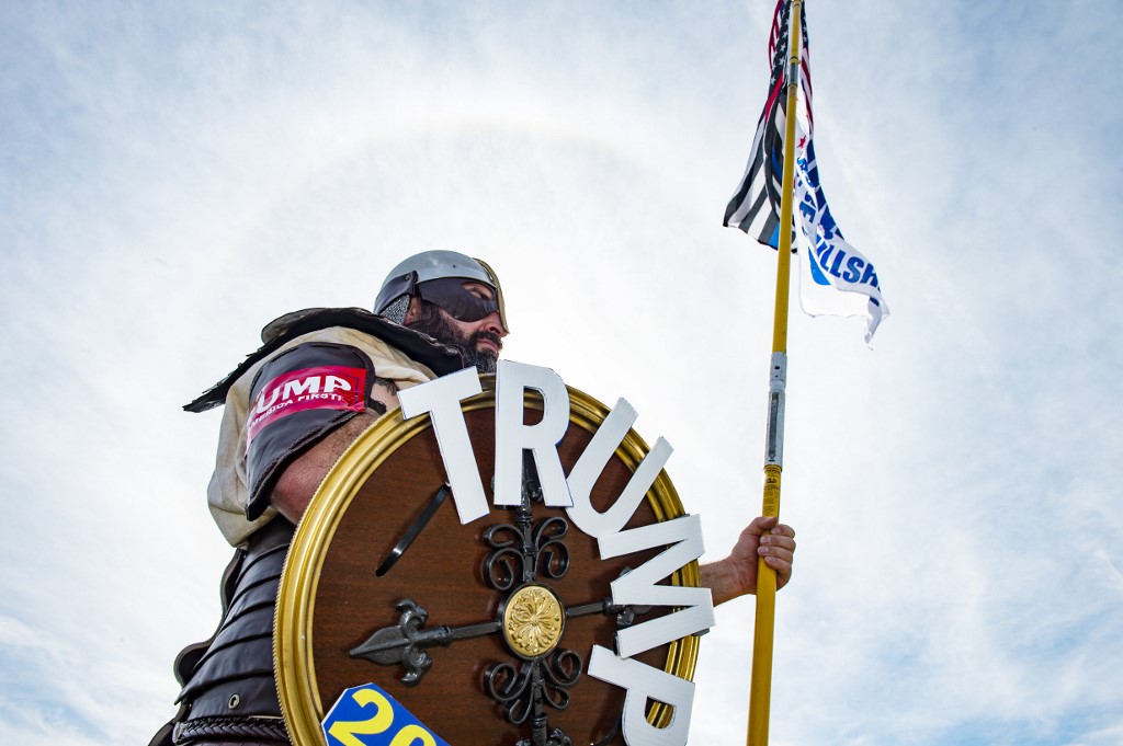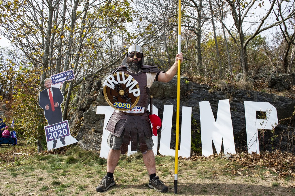 A contestant dressed as a viking version of President Trump poses for a portrait during a Trump campaign rally named "Trumptoberfest" at Rocky Point Park in Warwick, Rhode Island on October 11, 2020. Many supporters dressed in political campaign clothing and waved flags while others dressed in festive costumes to take part in a political costume contest. Joseph Prezioso / AFP
