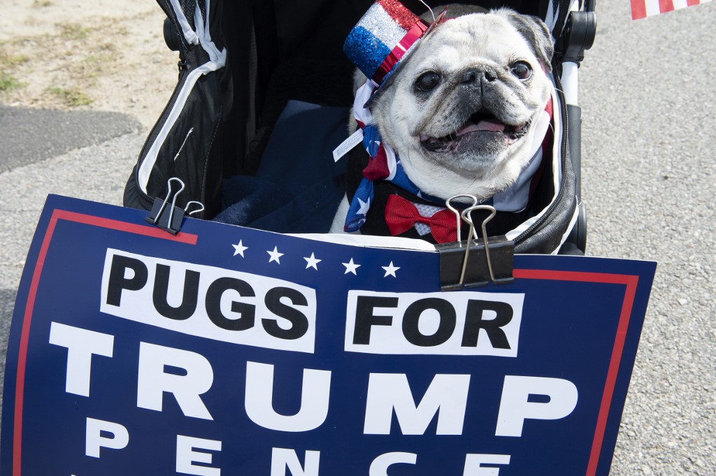 A pug sit in a baby carriage as people dressed in political costumes participate in a contest during a Trump campaign rally named "Trumptoberfest" at Rocky Point Park in Warwick, Rhode Island on October 11, 2020. Many supporters dressed in political campaign clothing and waved flags while others dressed in festive costumes to take part in a political costume contest. Joseph Prezioso / AFP