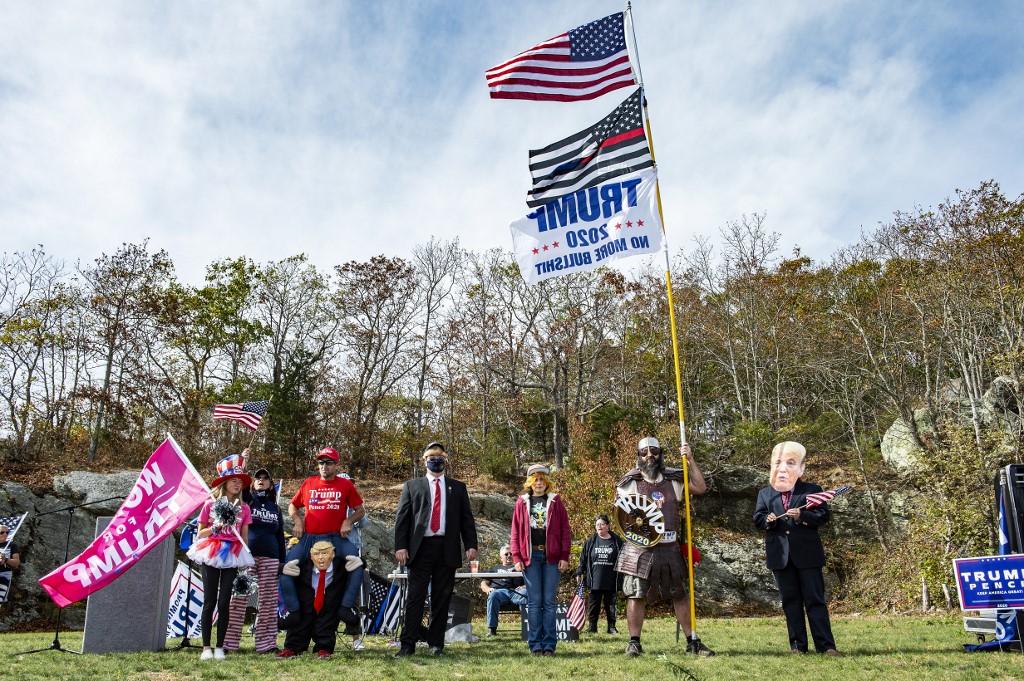 People dressed in political costumes participate in a contest during a Trump campaign rally named "Trumptoberfest" at Rocky Point Park in Warwick, Rhode Island on October 11, 2020. Many supporters dressed in political campaign clothing and waved flags while others dressed in festive costumes to take part in a political costume contest. Joseph Prezioso / AFP