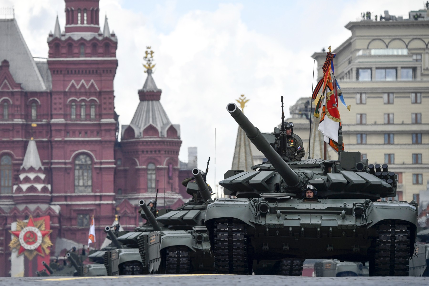 Military vehicles headed towards Red Square in Moscow while thousands of troops participated in the event.