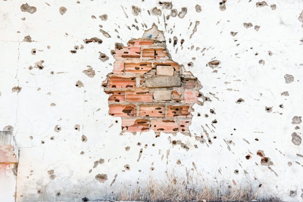 This picture shows a detail of a bullet-riddled brick wall, damaged during the Angolan civil war, in Kuito, Bie Province in Angola. RODGER BOSCH / AFP