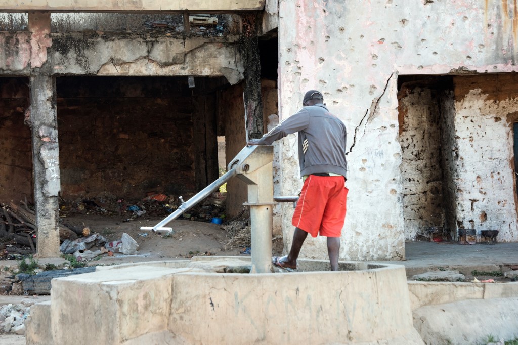 A man uses a hand pump to wash his feet outside a building damaged by bullet holes, dating from the Angolan civil war RODGER BOSCH / AFP