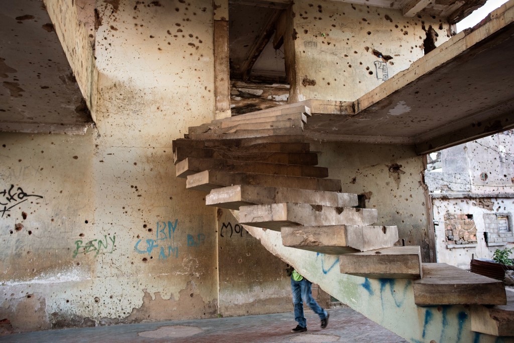 A person walks past a staircase in the bullet-riddled and graffiti-covered shell of a building that used to house Jonas Savimbi, leader of the rebel UNITA movement  RODGER BOSCH / AFP