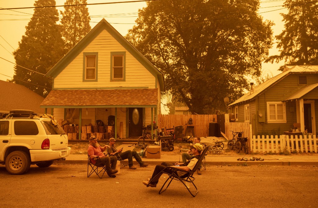 Residents drink and listen to country music in the street while ignoring a mandatory evacuation order as the Dixie fire approaches in Greenville, California on July 23, 2021. The Dixie fire, which started only a few miles from the deadly Camp fire, has churned through nearly150,000 acres and continues to burn towards rural communities. JOSH EDELSON / AFP