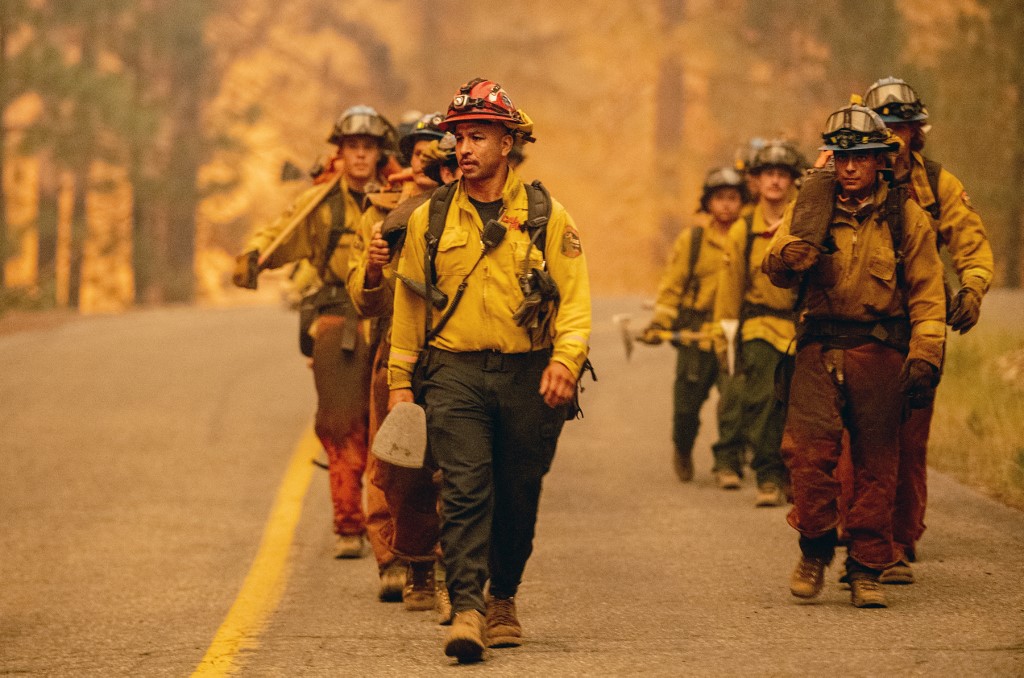 A crew of firefighters walk along a road while working the scene during the Dixie fire in the Prattville community of unincorporated Plumas County on July 23, 2021. JOSH EDELSON / AFP