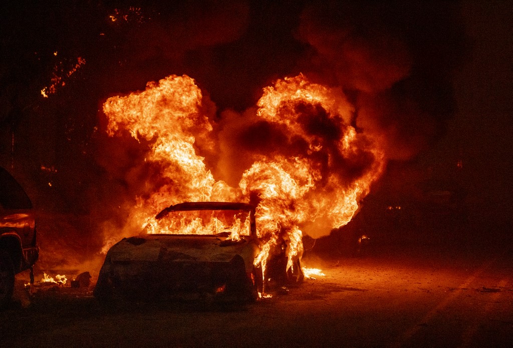 A Corvette explodes as flames from the Dixie fire tears through the Indian Falls neighborhood of unincorporated Plumas County, California on July 24, 2021. The Dixie fire, which started only a few miles from the origin of the deadly Camp fire, has churned through more than 185,000 acres and continues to burn towards rural communities. JOSH EDELSON / AFP