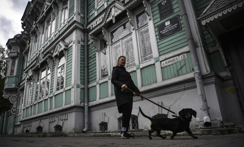 A woman walks a dog past former house of Russian architect Stanislav Khomich, 1904, a traditional wooden house in the Siberian city of Tomsk, on September 8, 2020. Tomsk is considered to be one of the oldest towns in Siberia founded in 1604. Wooden architecture is one of the symbols of the city of Tomsk, its distinctive feature. Today Tomsk is the only city in Siberia where the background wooden buildings have been preserved, reflecting the manor structure of the city streets. Unfortunately, many wooden houses are not in very good condition and require restoration. Alexander NEMENOV / AFP
