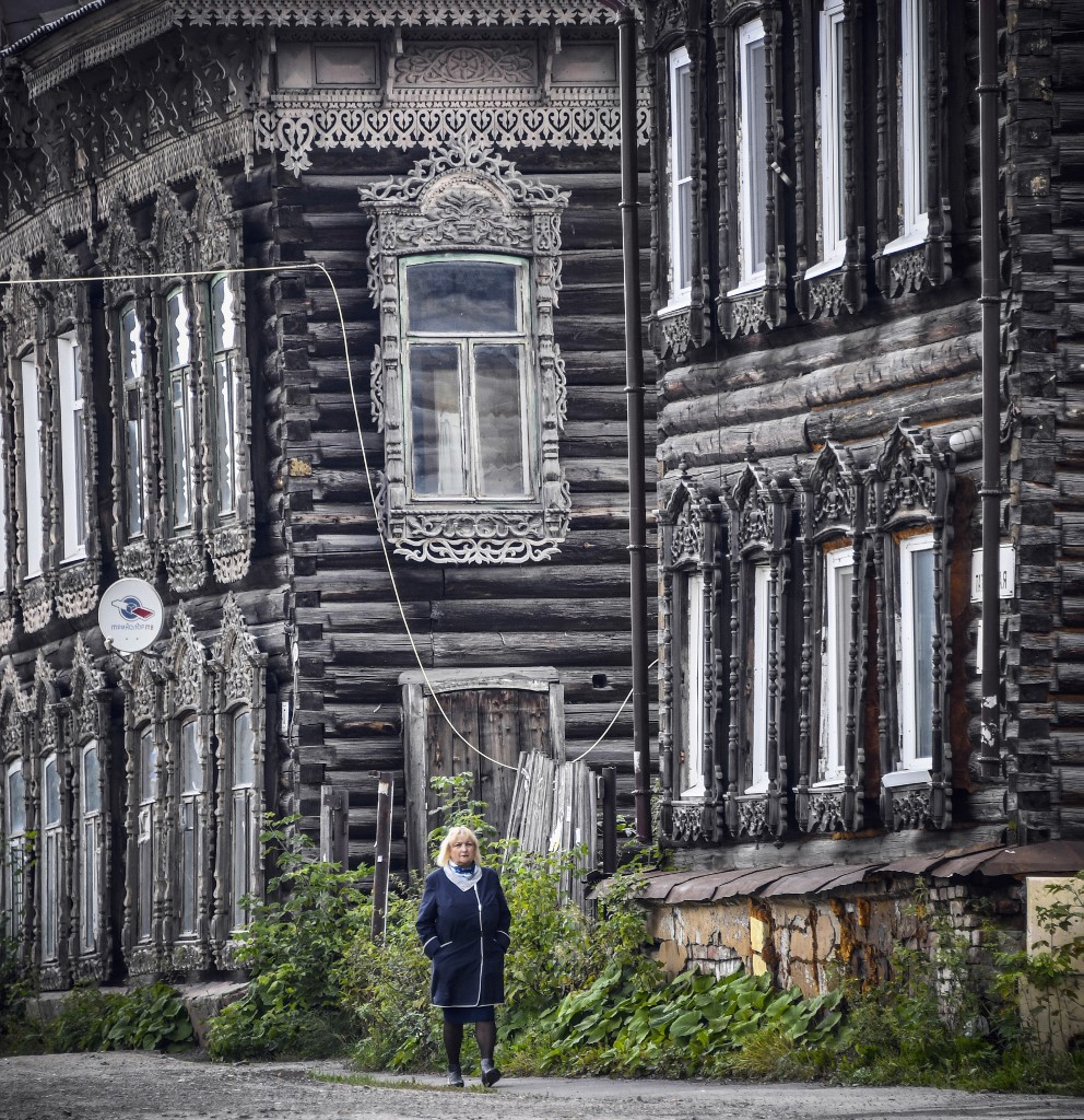 A woman walks past a traditional wooden house in the Siberian city of Tomsk on September 8, 2020. Tomsk is considered to be one of the oldest towns in Siberia founded in 1604. Wooden architecture is one of the symbols of the city of Tomsk, its distinctive feature. Today Tomsk is the only city in Siberia where the background wooden buildings have been preserved, reflecting the manor structure of the city streets. Unfortunately, many wooden houses are not in very good condition and require restoration. Alexan