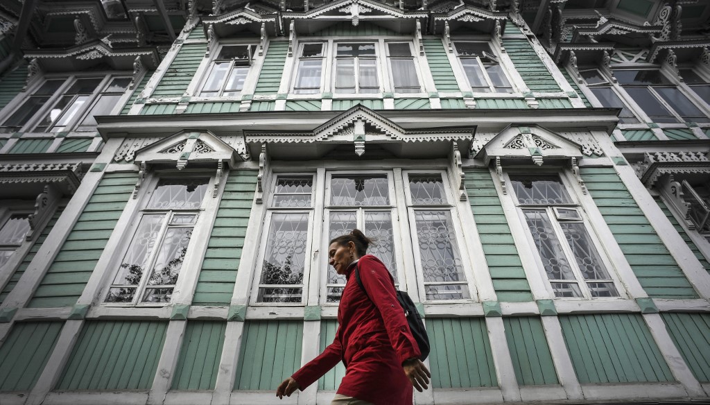 A woman walks past former house of Russian architect Stanislav Khomich, 1904, a traditional wooden house in the Siberian city of Tomsk, on September 8, 2020. Tomsk is considered to be one of the oldest towns in Siberia founded in 1604. Wooden architecture is one of the symbols of the city of Tomsk, its distinctive feature. Today Tomsk is the only city in Siberia where the background wooden buildings have been preserved, reflecting the manor structure of the city streets. Unfortunately, many wooden houses ar
