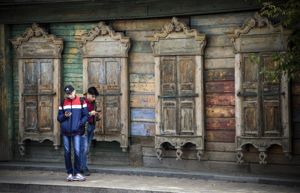 People stand in front of a traditional wooden house in the Siberian city of Tomsk on September 8, 2020. Tomsk is considered to be one of the oldest towns in Siberia founded in 1604. Wooden architecture is one of the symbols of the city of Tomsk, its distinctive feature. Today Tomsk is the only city in Siberia where the background wooden buildings have been preserved, reflecting the manor structure of the city streets. Unfortunately, many wooden houses are not in very good condition and require restoration.
