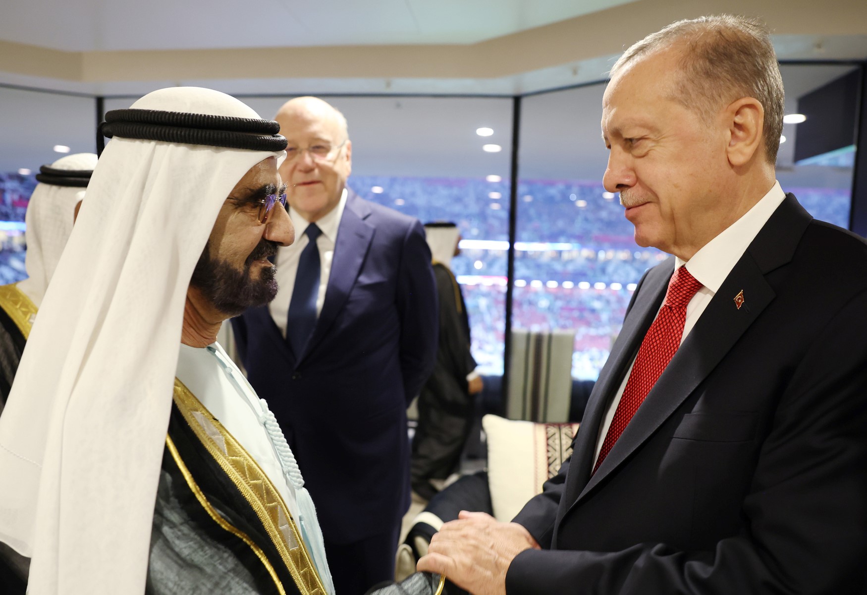 This handout photograph taken and released by The Press Office of the Presidency of Turkey on November 20, 2022, shows Turkish President Recep Tayyip Erdogan (R) shakes hands with UAE's Vice President and Prime Minister Sheikh Mohammed bin Rashid al-Maktoum as they are welcomed on the occasion of the opening ceremony of the 2022 FIFA World Cup in Doha, Qatar. (Photo by Handout / Press Office of the Presidency of Turkey / AFP)