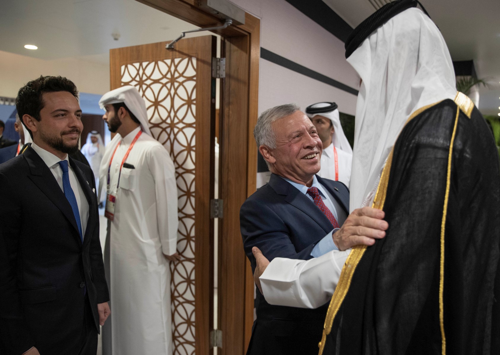 Qatar's Emir Sheikh Tamim bin Hamad al-Thani (R) welcoming King Abdullah II (C) and his son Crown Prince Al Hussein, ahead of the opening of the Qatar 2022 World Cup football tournament in Doha, on November 20, 2022.