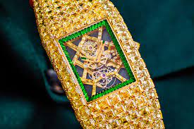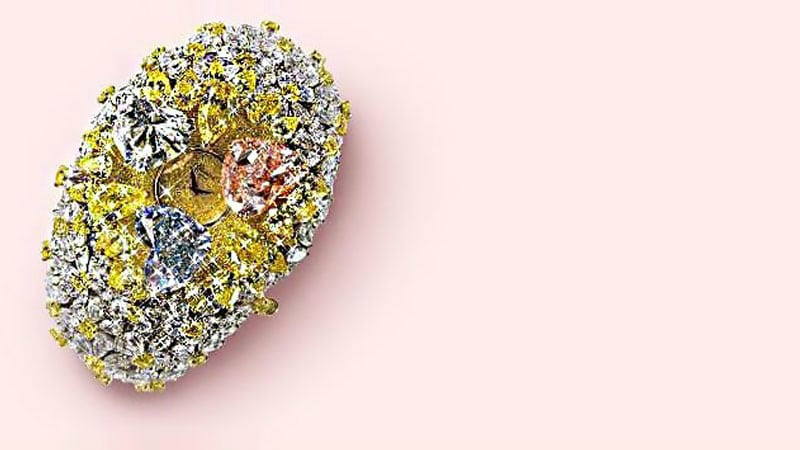 "The Hallucination by Graff Diamonds" is a perfect piece for those who appreciate luxury. While its inner workings might not be the sole reason for its price, the watch contains 110 carats of exceptionally rare colored diamonds. John Graff, along with a team of gemologists and skilled craftsmen, invested thousands of hours into designing this masterpiece. The "Graff Hallucination" debuted in 2014 and took the world by storm, instantly becoming the most expensive watch ever made. Its assembly is a marvel, with diamonds and rare stones precisely set in a captivating rainbow design, and the platinum bracelet showcasing a spectrum of colors, including stunning shades of pink, blue, green, yellow, and orange.