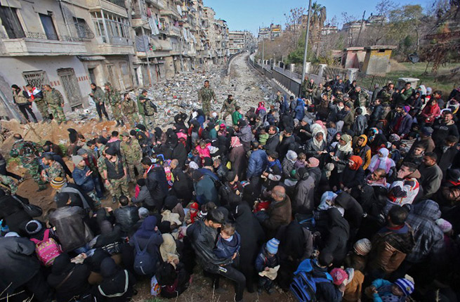 Aleppo’s exodus: Syrian residents fleeing violence gather at a checkpoint, manned by pro-government forces, in the Maysaloun neighborhood of Aleppo on December 8, 2016.
