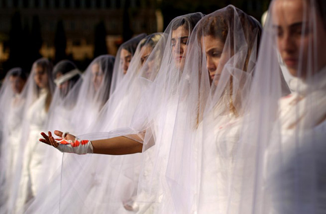Scrapping laws that protect rapists: Activists from the Lebanese NGO Abaad (Dimensions), a resource center for gender equality, dressed as brides and wearing bandages hold a protest in downtown Beirut on December 6, 2016, against article 522 in the Lebanese penal code.