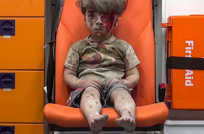 Damned if you stay, damned if you go: A young Syrian boy sits injured in the back of an ambulance after being pulled from the rubble by civil defense workers following a reported government airstrike in eastern Aleppo.
