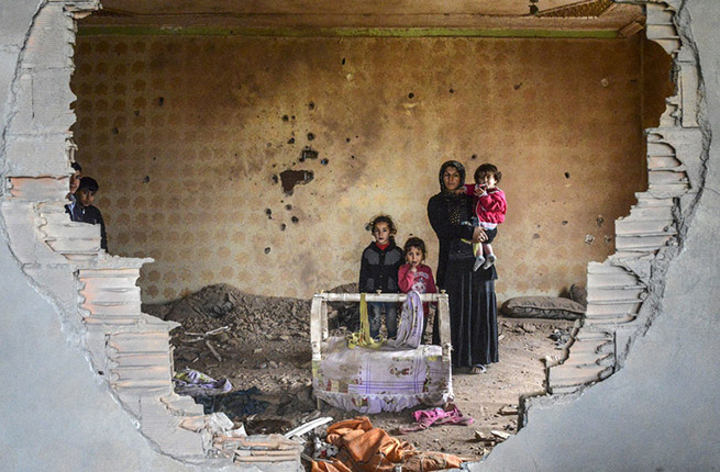 Turkey’s descent into war: A woman and her children stand in the ruins of battle-damaged house in the Kurdish town of Silopi, in southeastern Turkey, near the border with Iraq on January 19, 2016.