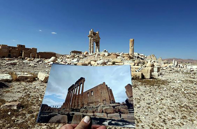 Before and after: A pre-war snapshot shows the devastation to the ancient city of Palmyra after being recaptured from Daesh by Syrian troops.