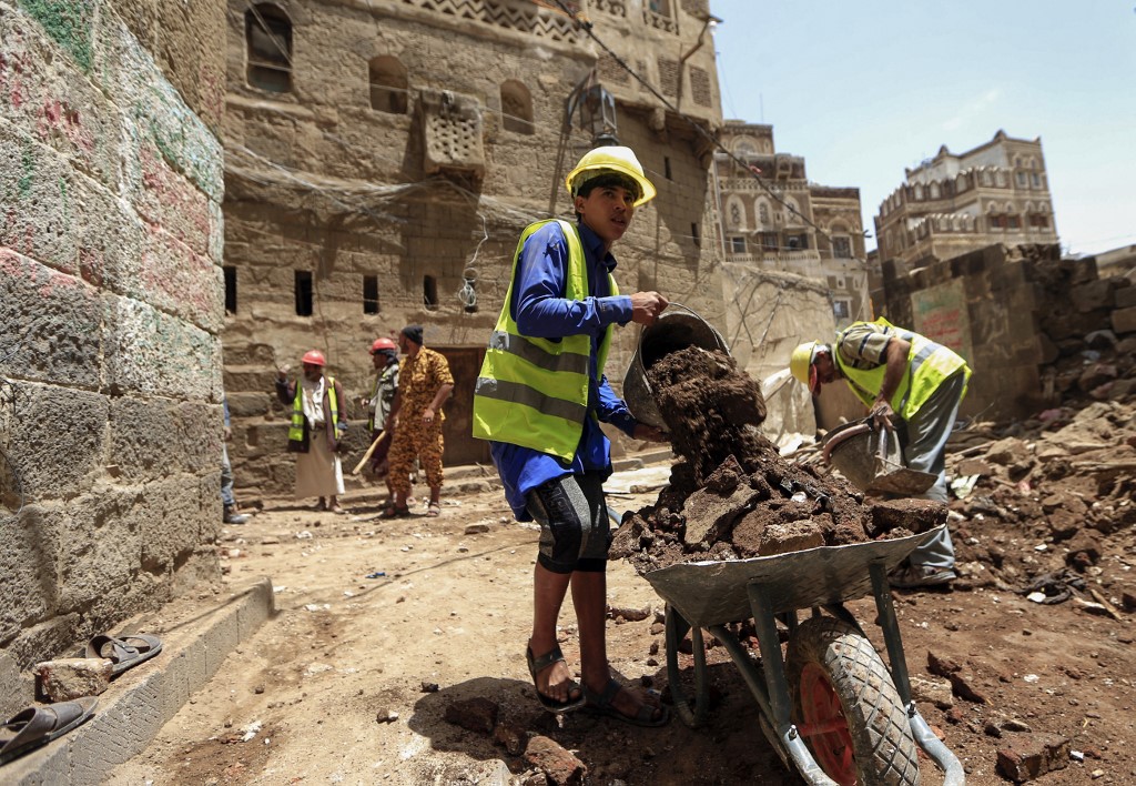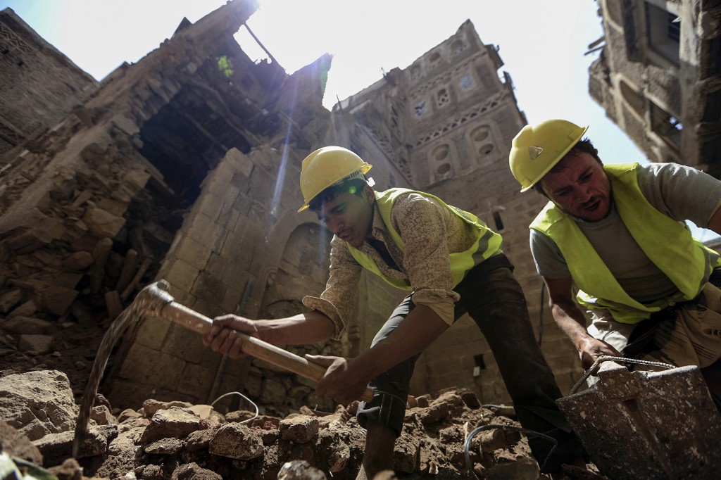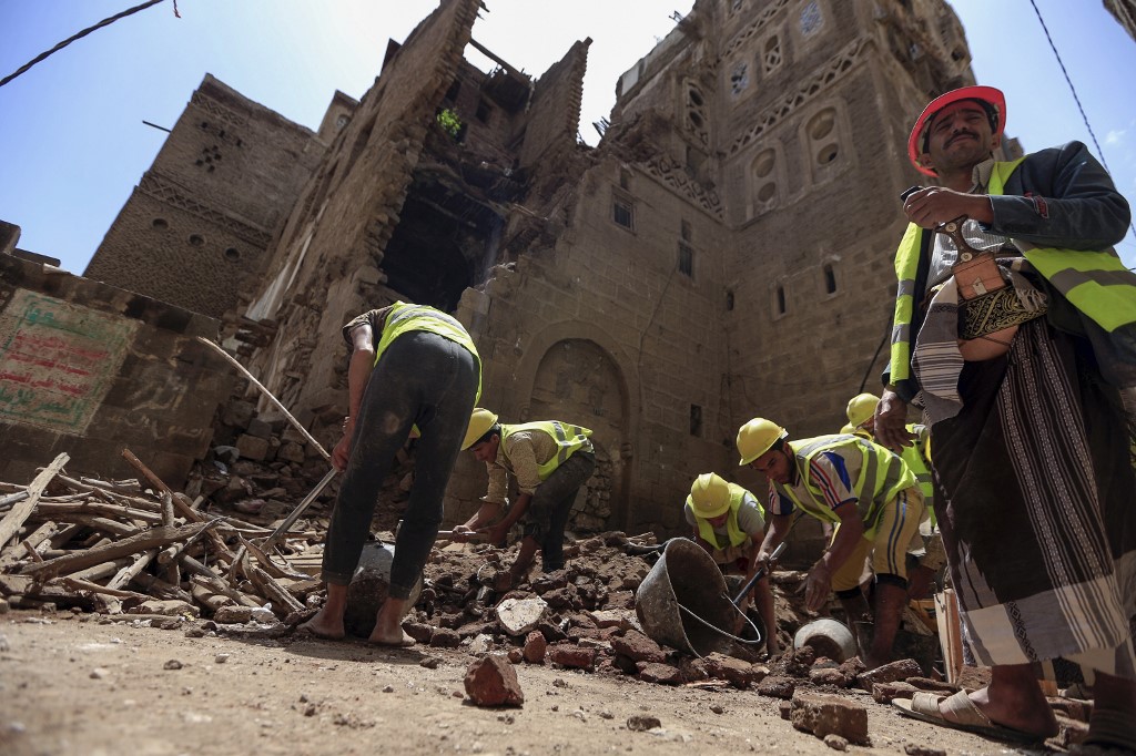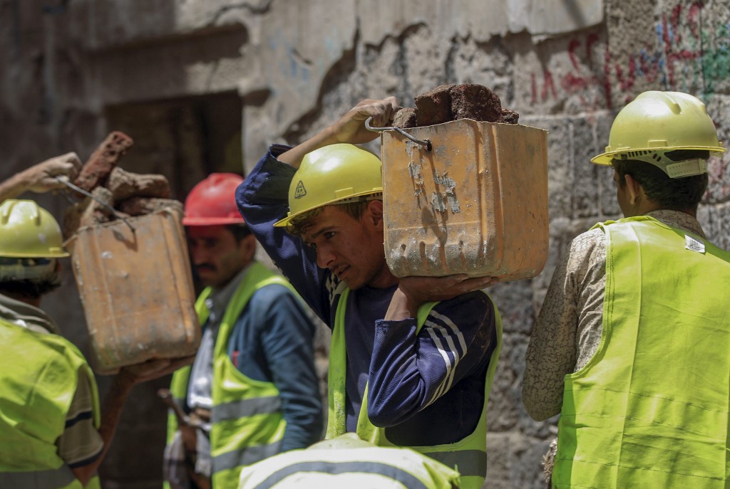 Yemeni labourers remove the rubble ahead of restoration works on the site of a collapsed UNESCO-listed building following heavy rains, in the old city of the Yemeni capital Sanaa, on August 12, 2020. Flash floods triggered by torrential rains have killed at least 172 people across Yemen over the past month, damaging homes and UNESCO-listed world heritage sites, officials said. Mohammed HUWAIS / AFP