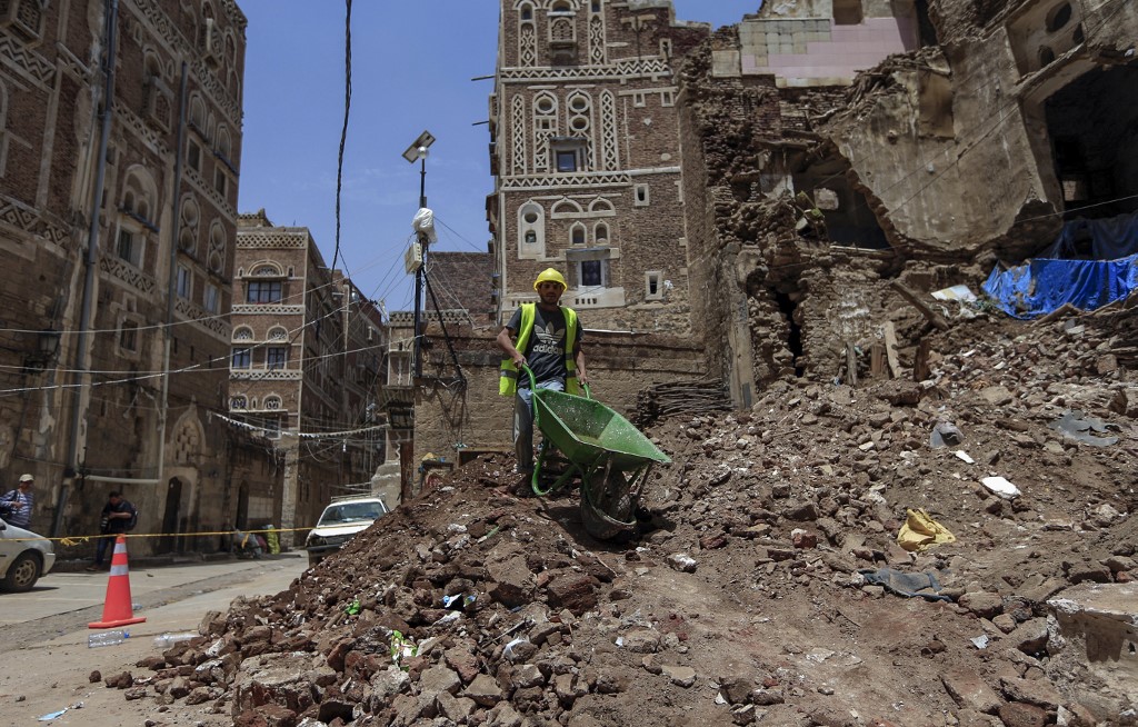 A Yemeni labourer removes the rubble ahead of restoration works on the site of a collapsed UNESCO-listed building following heavy rains, in the old city of the Yemeni capital Sanaa, on August 12, 2020. Flash floods triggered by torrential rains have killed at least 172 people across Yemen over the past month, damaging homes and UNESCO-listed world heritage sites, officials said. Mohammed HUWAIS / AFP