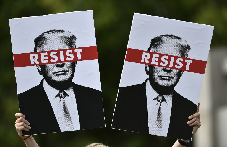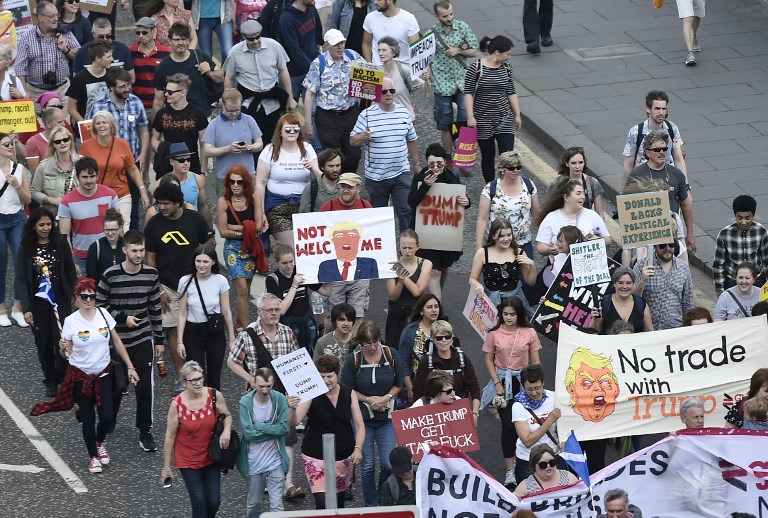 People marched in Edinburgh from the Scottish Parliament to the Meadows, waving placards with messages including “Dump Trump” and ”Love Trumps Hate,” as part of a so-called “Carnival of Resistance”.