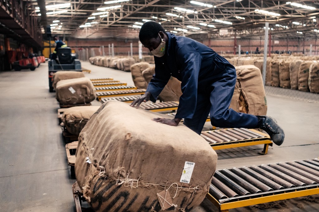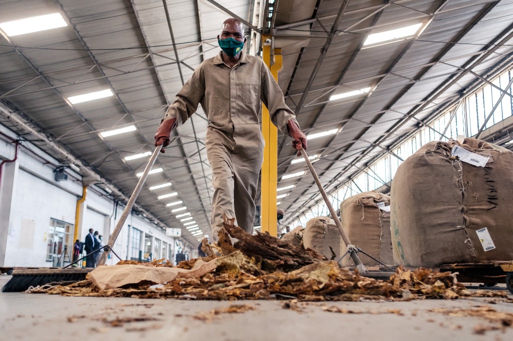 A worker sweeps tobacco leaves off the floor during the official opening of the tobacco selling season with few farmers in attendance due to COVID-19 restrictions at the Tobacco Sales Floors (TSF) in Harare on April 7, 2021. Jekesai NJIKIZANA / AFP