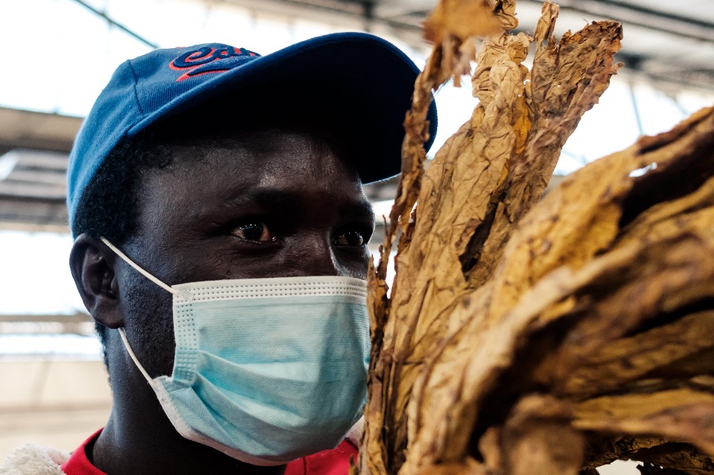 Steady Zvavamwe, 38, a tobacco farmer, inspects some of the golden leaf during the official opening of the tobacco selling season with few farmers in attendance due to COVID-19 restrictions at the Tobacco Sales Floors (TSF) in Harare on April 7, 2021. Jekesai NJIKIZANA / AFP