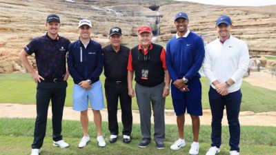 Justin Rose of England, Justin Thomas of the United States, Gary Player, Jack Nicklaus, Tiger Woods of the United States and Rory McIlroy of Northern Ireland pose for a photo prior to the Payne’s Valley Cup on September 22, 2020 on the Payne’s Valley course at Big Cedar Lodge in Ridgedale, Missouri. Tom Pennington/Getty Images for Payne’s Valley Cup/AFP