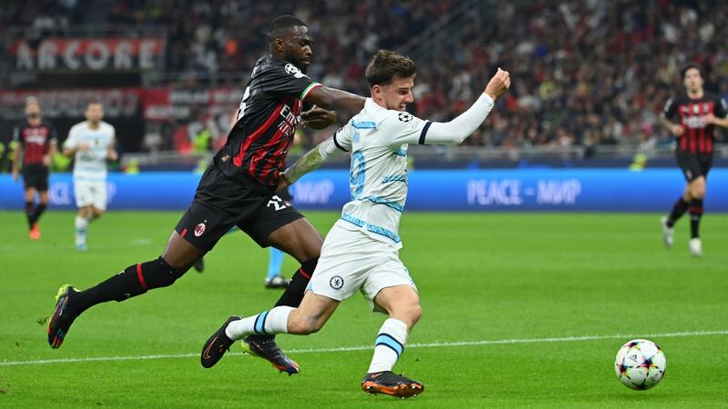 AC Milan's British defender Fikayo Tomori (L) fights for the ball with Chelsea's English midfielder Mason Mount during the UEFA Champions League group E, football match between AC Milan and Chelsea, at the San Siro stadium, in Milan, on October 11, 2022. (Photo by Alberto PIZZOLI / AFP)