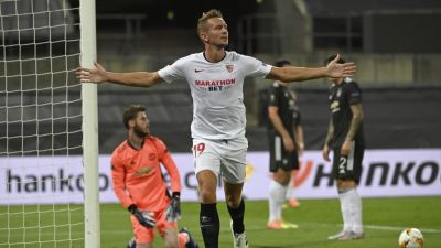Luuk De Jong celebrates scoring during the UEFA Europa League semi-final football match Sevilla v Manchester United on August 16, 2020 in Cologne, western Germany.