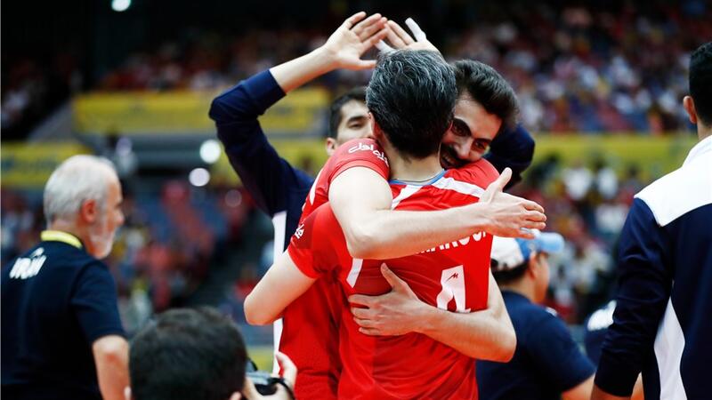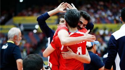Iranian volleyball players celebrate their victory against France at the 2017 FIVB Volleyball Men's World Grand Champions Cup in Japan.