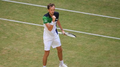 Russia's Daniil Medvedev reacts during the men's singles semi-final tennis match against Germany's Oscar Otte at the ATP 500 Halle Open tennis tournament in Halle, western Germany, on June 18, 2022. (Photo by Carmen JASPERSEN / AFP)